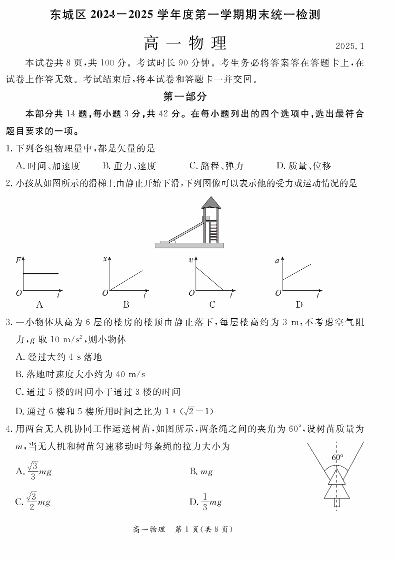 东城区2024-2025学年高一年级第一学期期末统一检测 物理.pdf