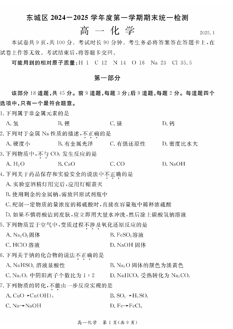 东城区2024-2025学年高一年级第一学期期末统一检测 化学.pdf