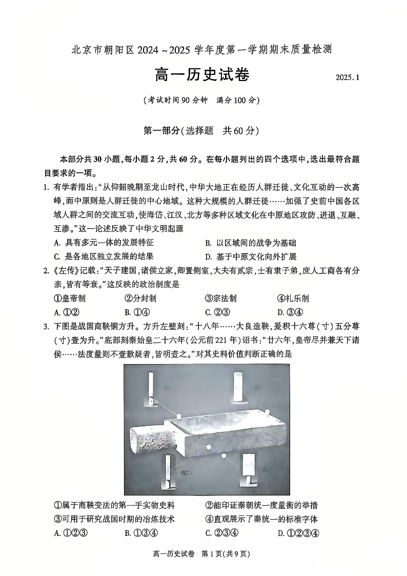 北京市朝阳区2024-2025学年高一年级第一学期期末质量检测 历史.pdf