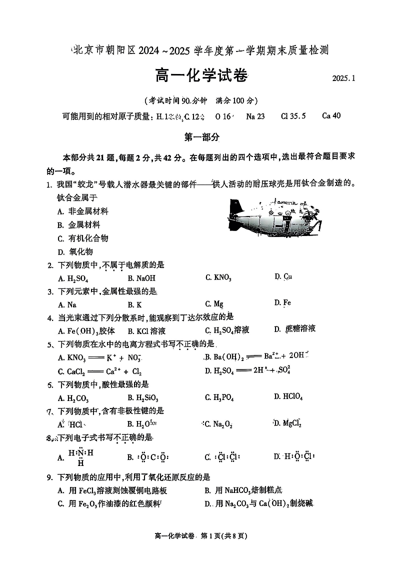 北京市朝阳区2024-2025学年高一年级第一学期期末质量检测 化学.pdf