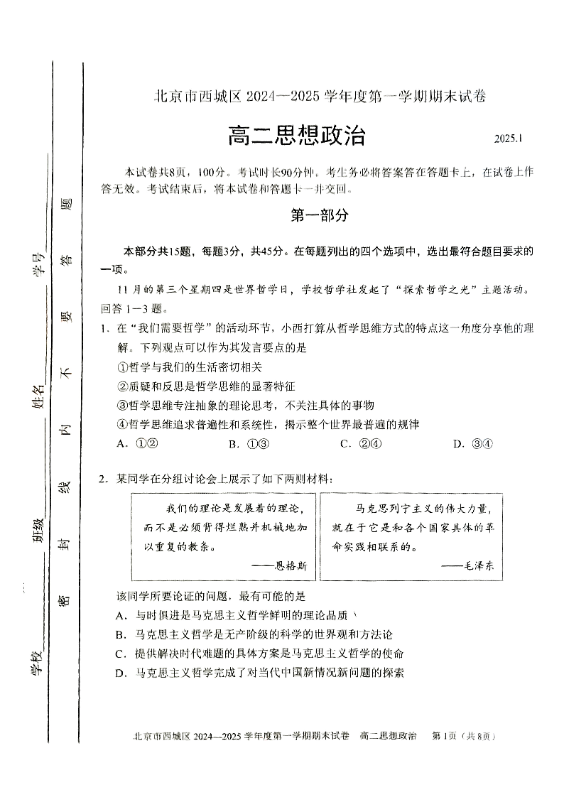 北京市海淀区2024-2025学年高二第一学期期末试卷 政治.pdf