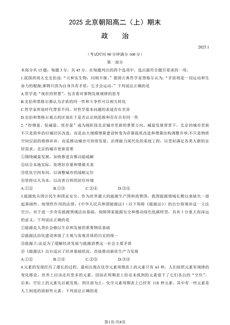北京市朝阳区2024-2025学年高二年级第一学期期末质量检测 政治.pdf