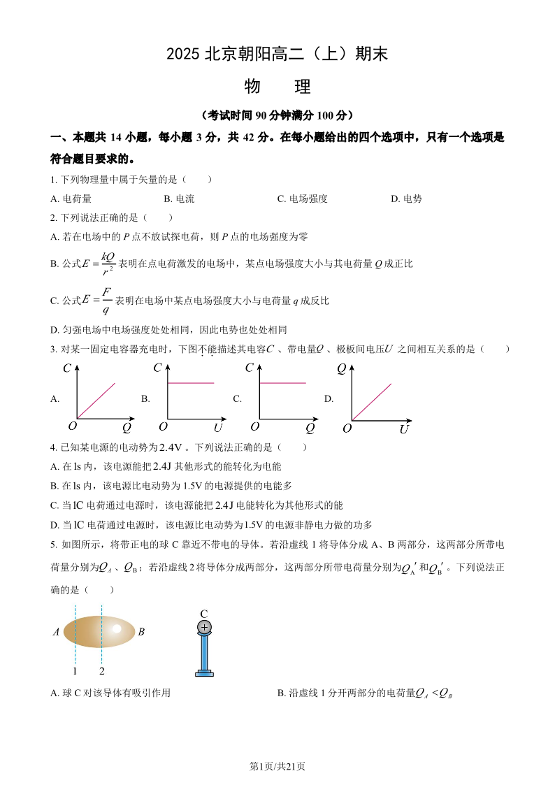 北京市朝阳区2024-2025学年高二年级第一学期期末质量检测 物理.pdf