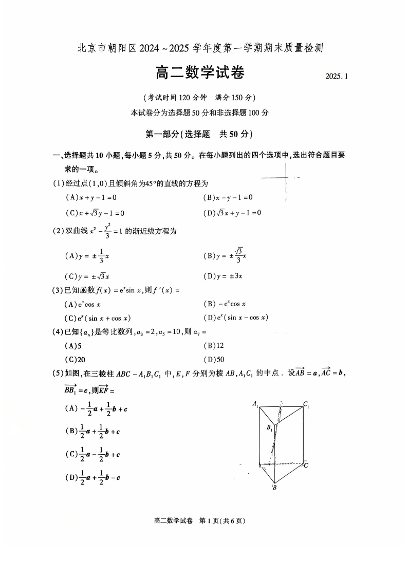 北京市朝阳区2024-2025学年高二年级第一学期期末质量检测 数学.pdf