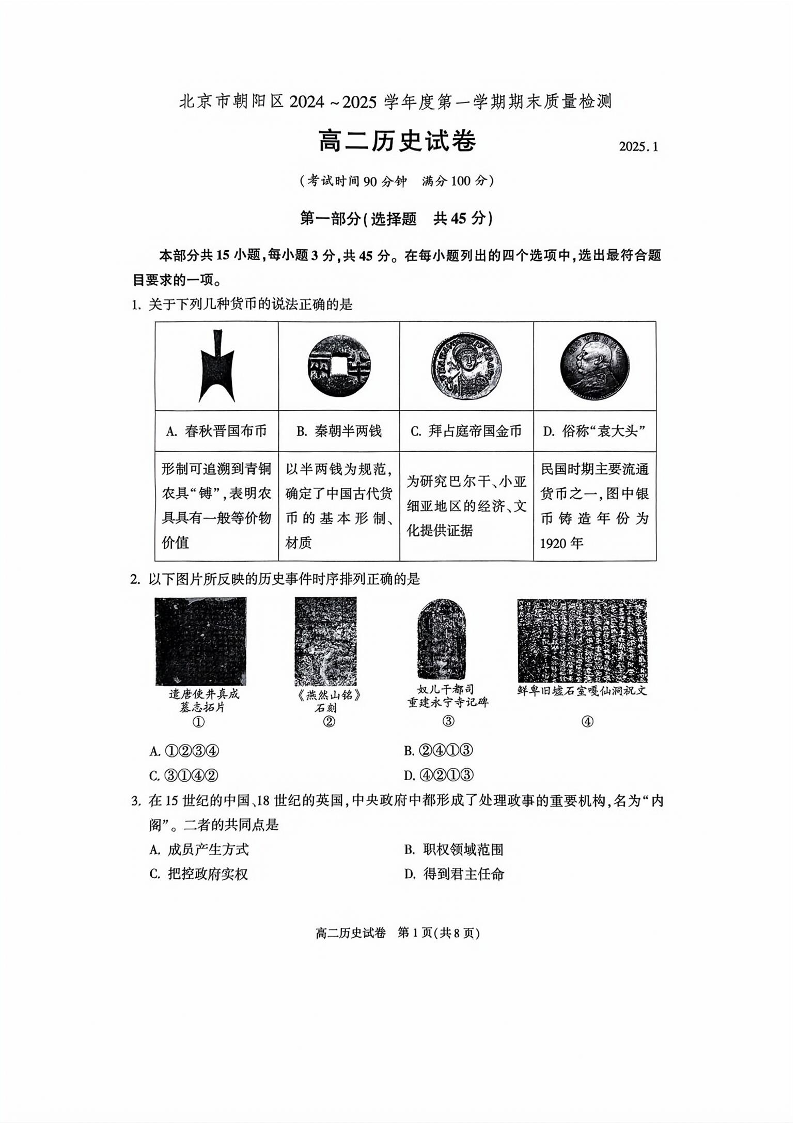 北京市朝阳区2024-2025学年高二年级第一学期期末质量检测 历史.pdf
