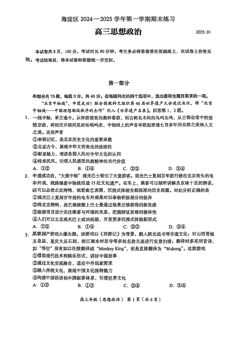 海淀区2024-2025学年高三第一学期期末练习 政治.pdf