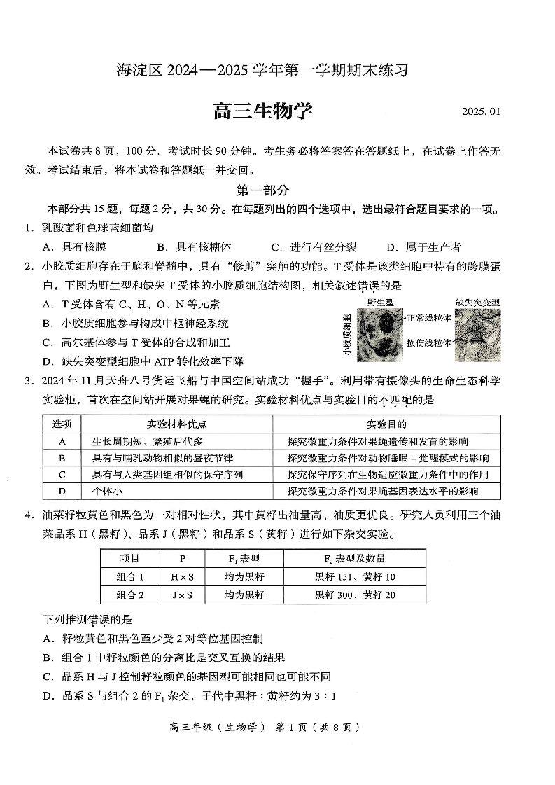 海淀区2024-2025学年高三第一学期期末练习 生物.pdf