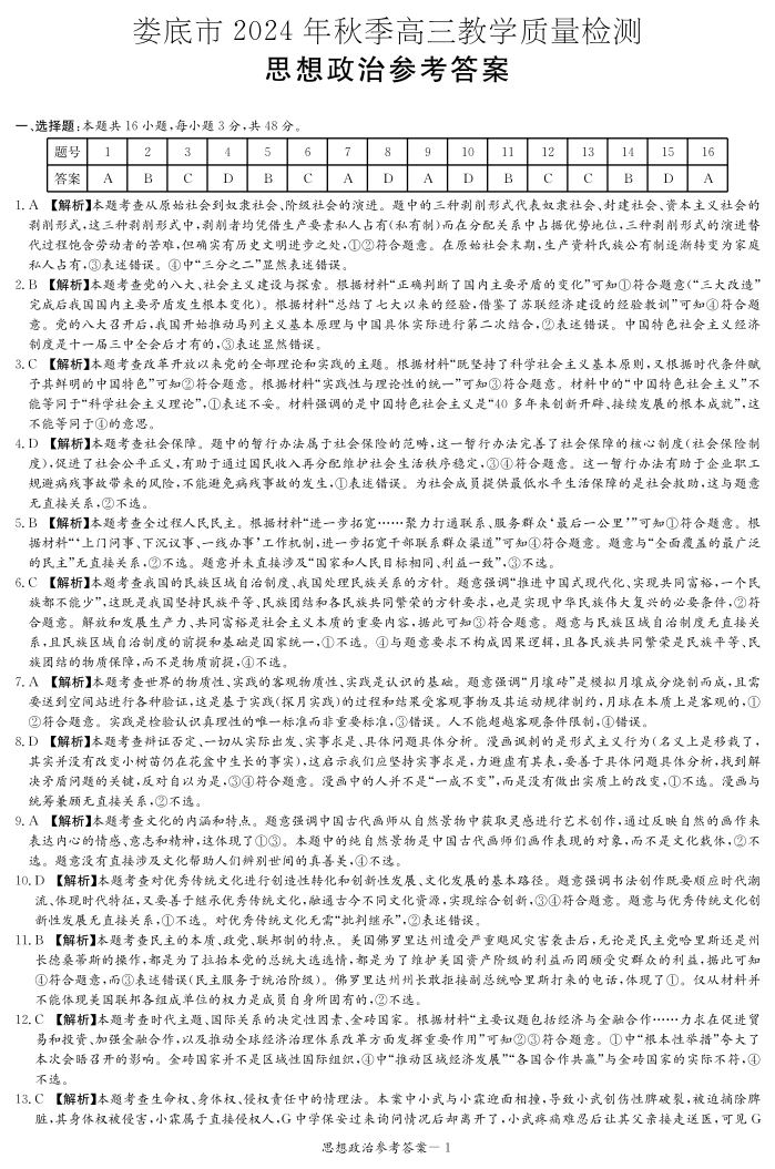娄底市2024年秋季高三期末质量检测 政治答案.pdf