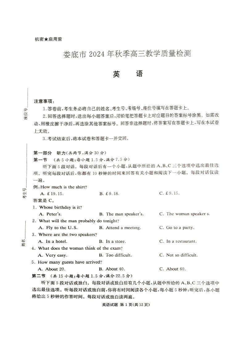 娄底市2024年秋季高三期末质量检测 英语.pdf