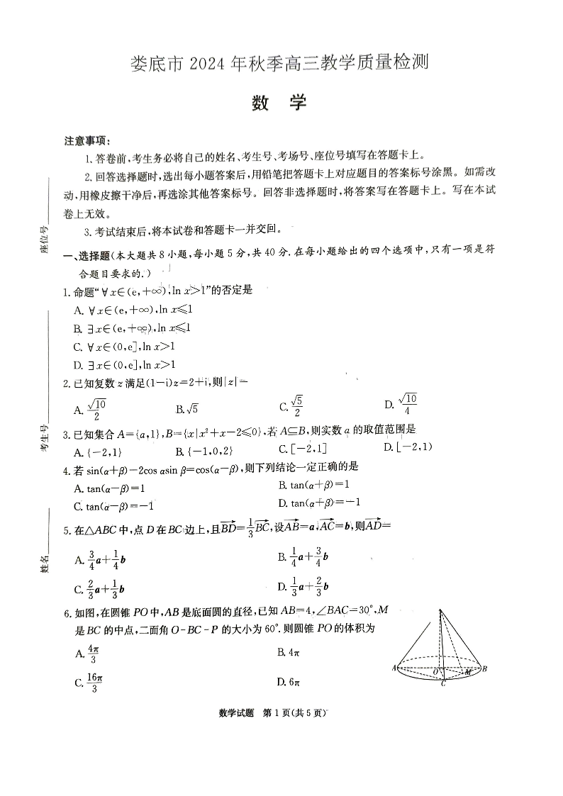 娄底市2024年秋季高三期末质量检测 数学.pdf