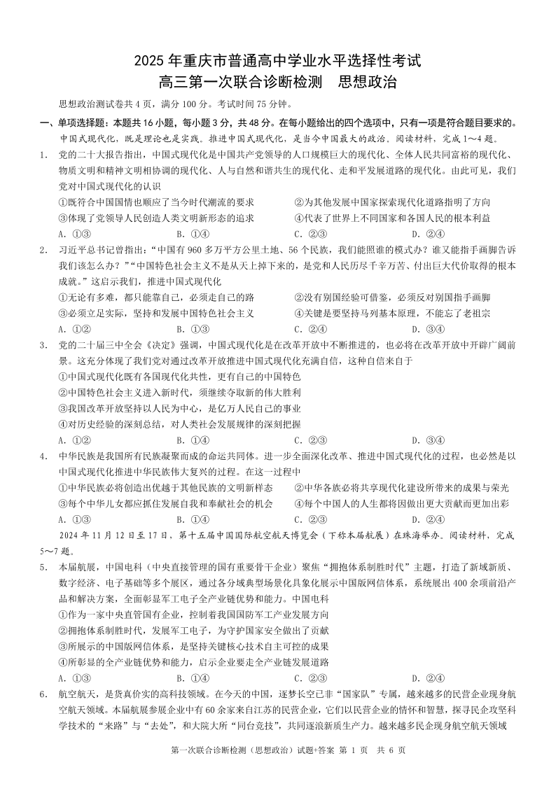重庆市康德卷2025年高三第一次联合诊断检测(重庆一诊)政治.pdf