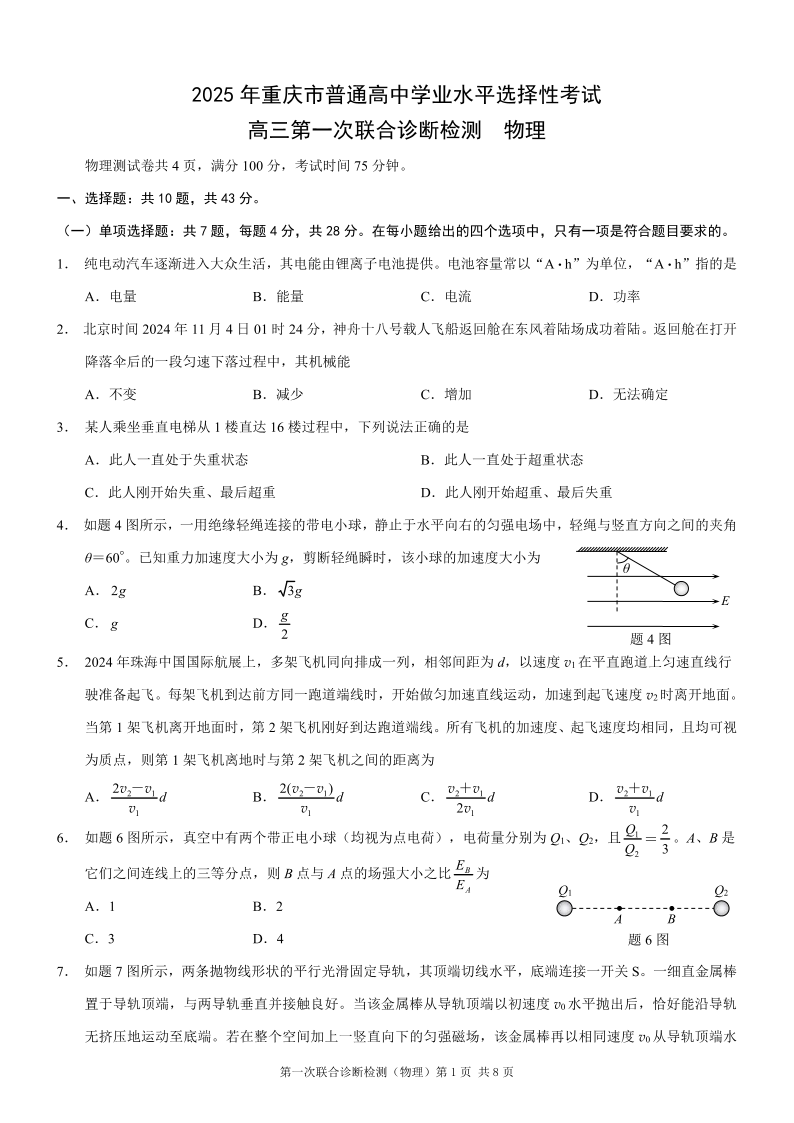 重庆市康德卷2025年高三第一次联合诊断检测(重庆一诊)物理.pdf