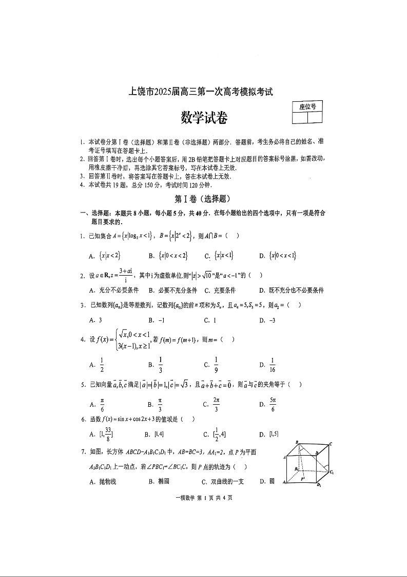 上饶市2025届高三第一次高考模拟考试 数学.docx