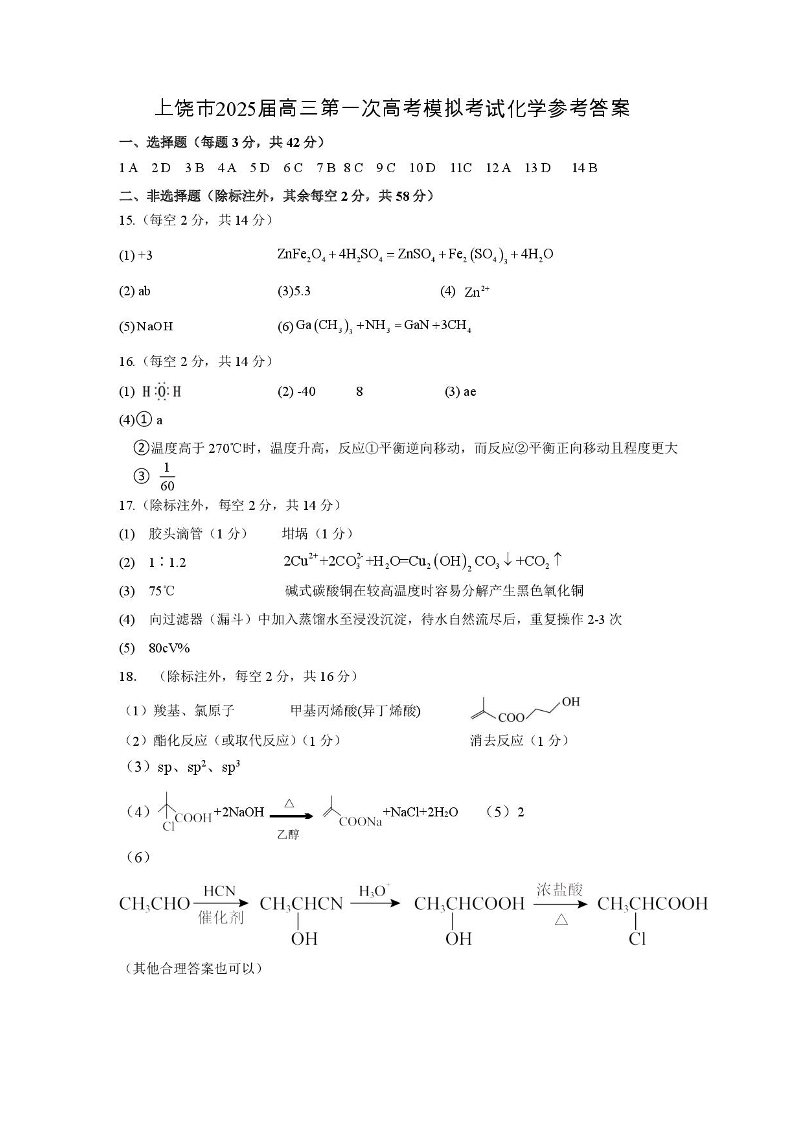 上饶市2025届高三第一次高考模拟考试 化学参考答案.pdf