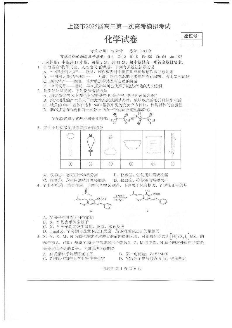上饶市2025届高三第一次高考模拟考试 化学.pdf