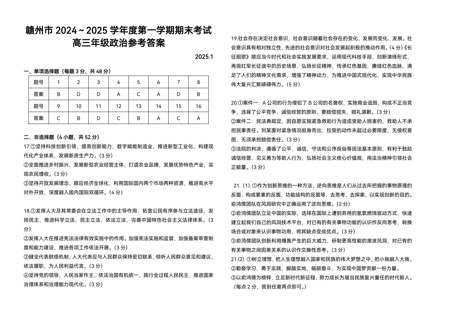 江西省赣州市2025届高三上学期1月期末考试 政治答案.pdf