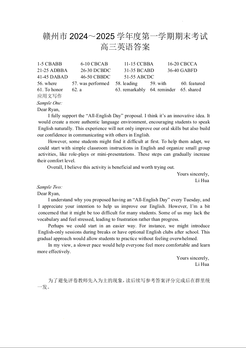 江西省赣州市2025届高三上学期1月期末考试 英语答案.docx