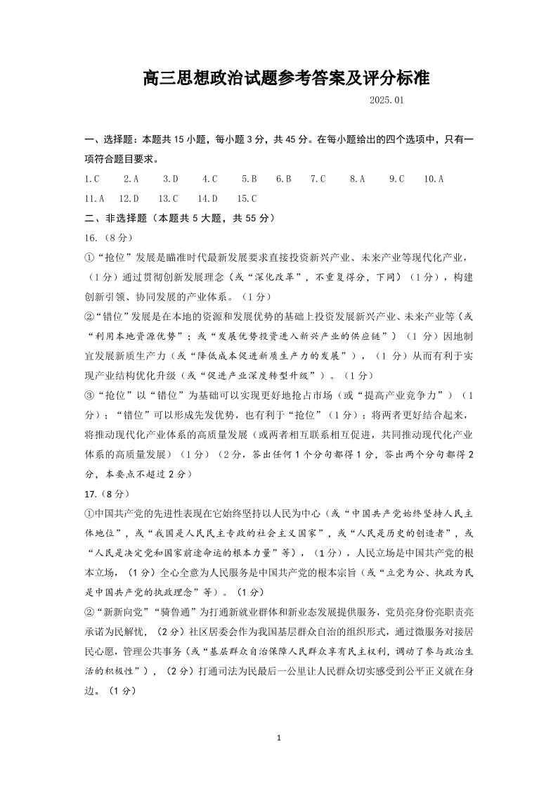 2025年1月济南市高三期末学习质量检测 政治答案.pdf