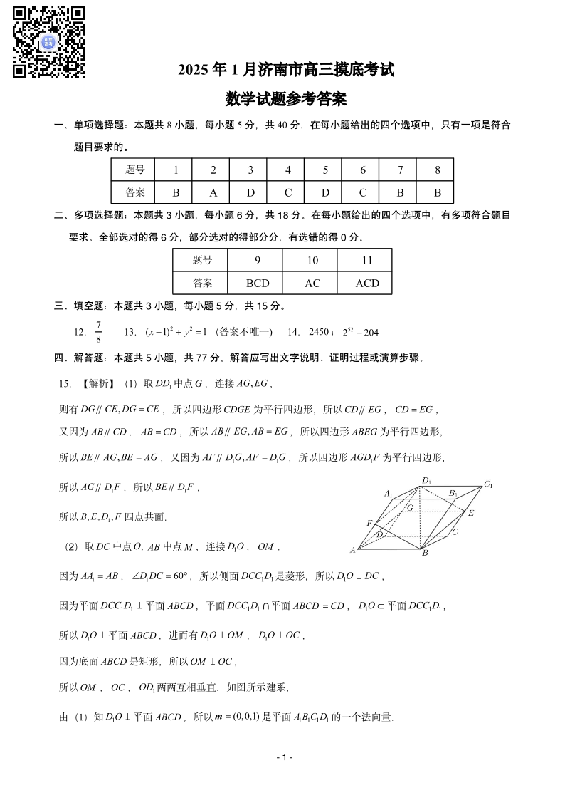 2025年1月济南市高三期末学习质量检测 数学答案.pdf