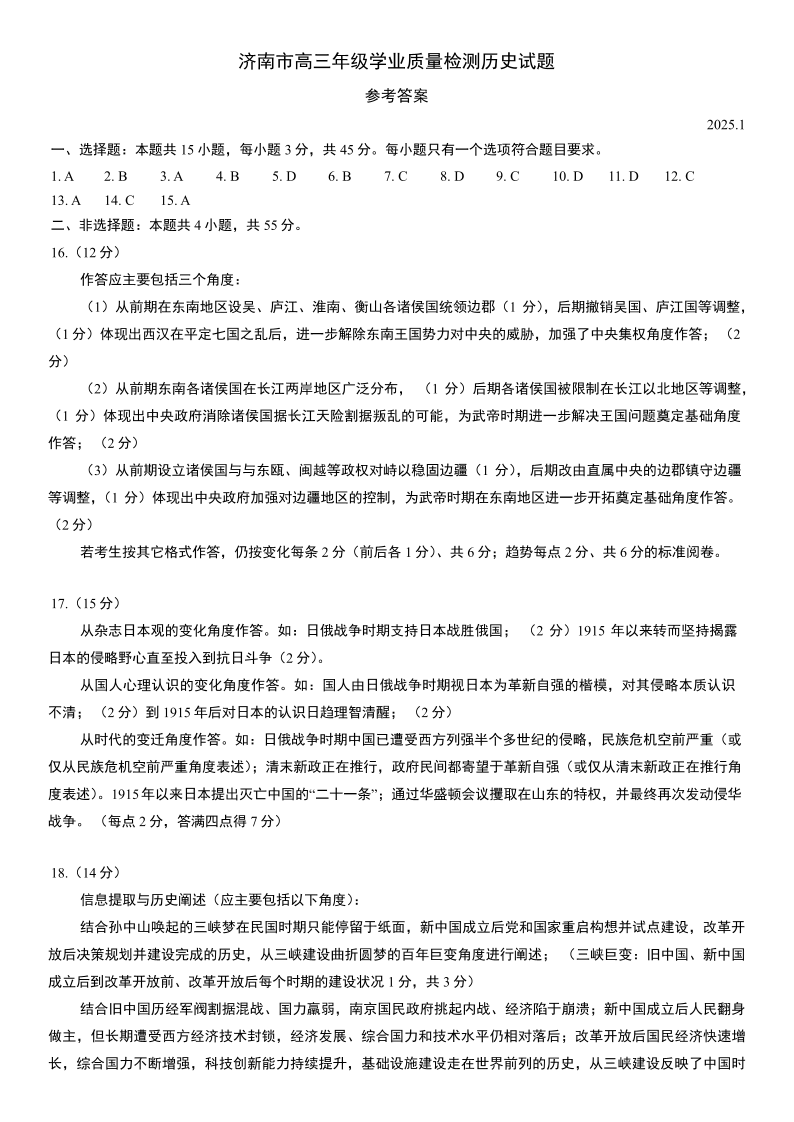 2025年1月济南市高三期末学习质量检测 历史答案.pdf