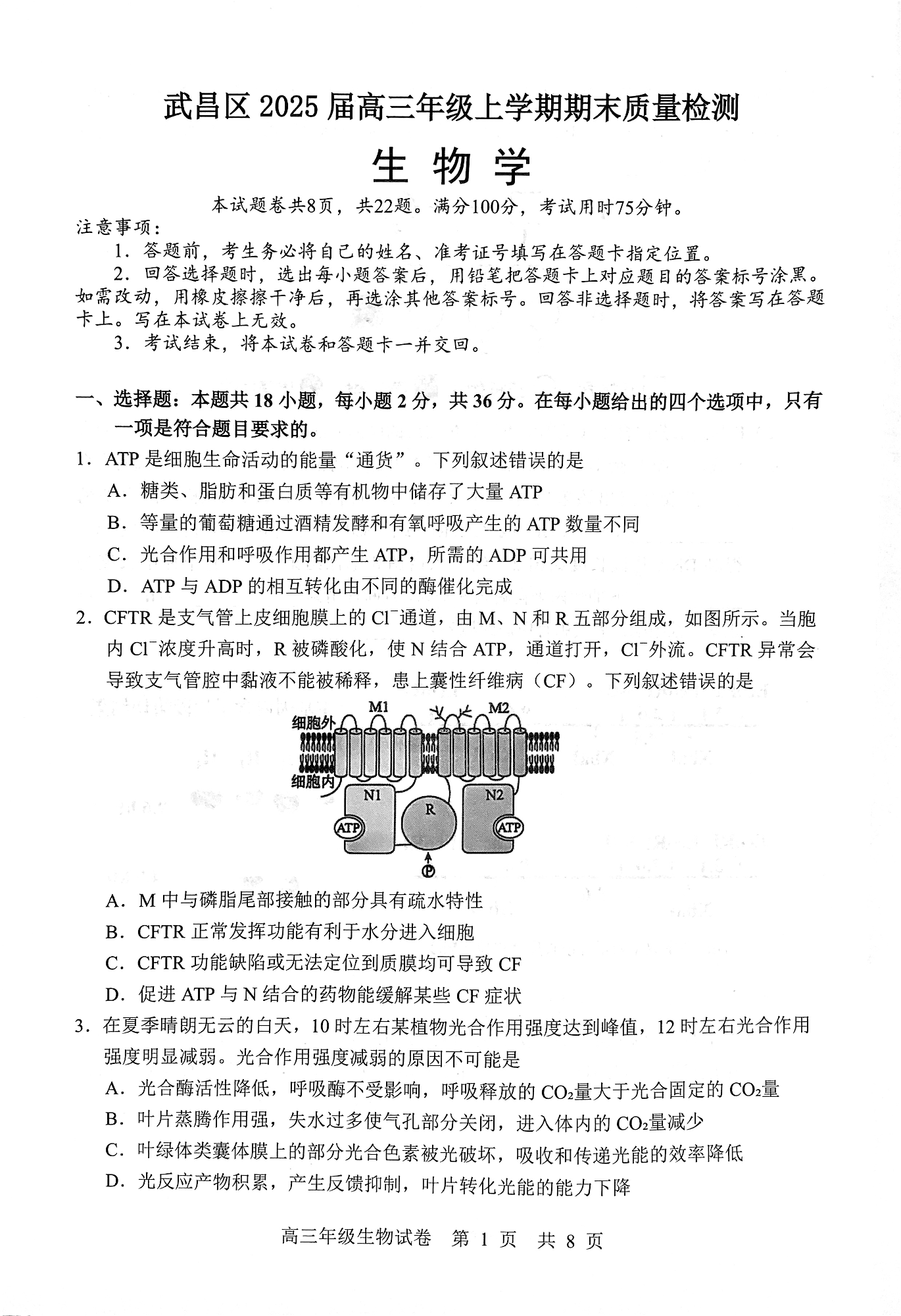 武昌区2025届高三年级上学期期末质量检测 生物.pdf