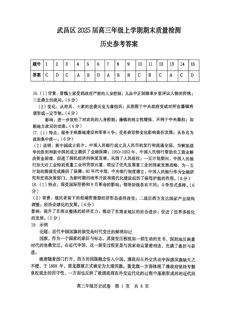 武昌区2025届高三年级上学期期末质量检测 历史答案.pdf