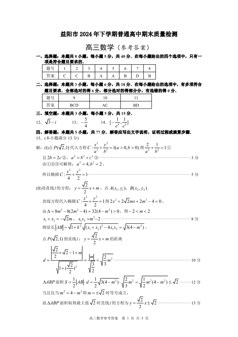 益阳市2024年下学期普通高中期末质量检测 数学参考答案.pdf