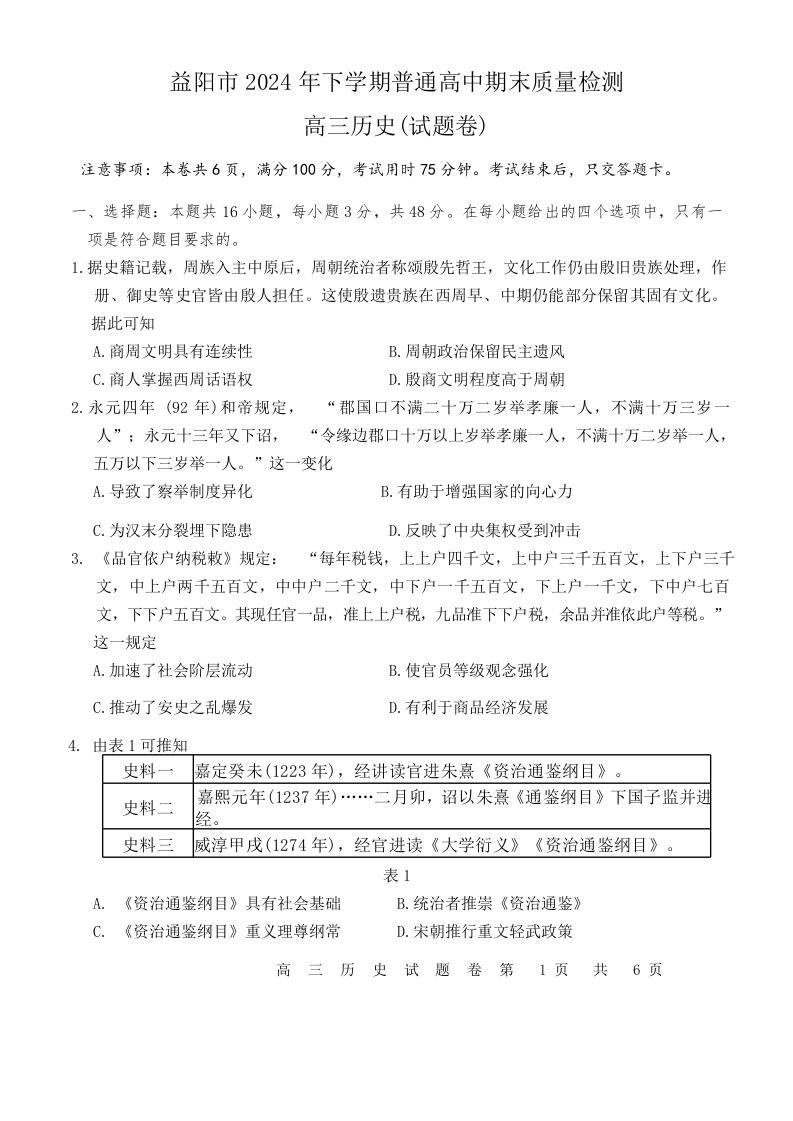 益阳市2024年下学期普通高中期末质量检测 历史.docx