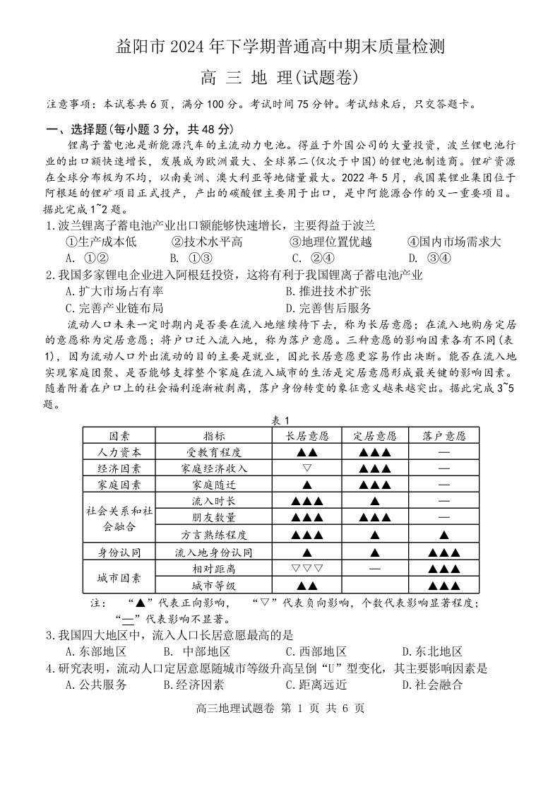 益阳市2024年下学期普通高中期末质量检测 地理.docx