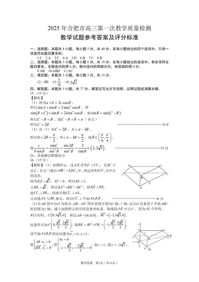 安徽省合肥市2025届高三第一次教学质量检测 数学答案.pdf