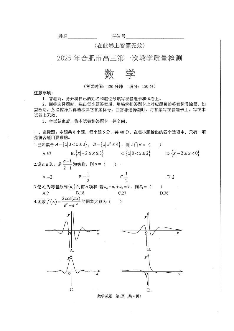 安徽省合肥市2025届高三第一次教学质量检测 数学.pdf