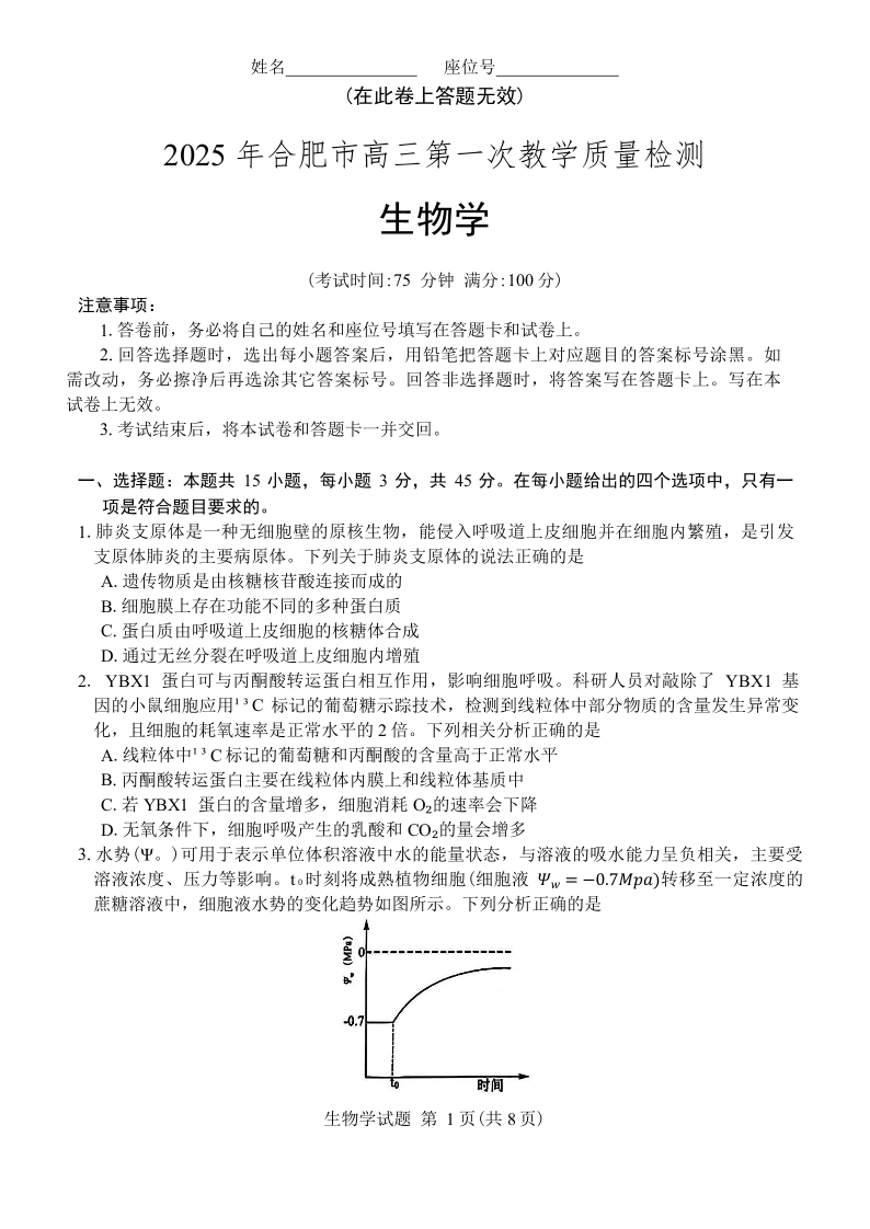 安徽省合肥市2025届高三第一次教学质量检测 生物.pdf
