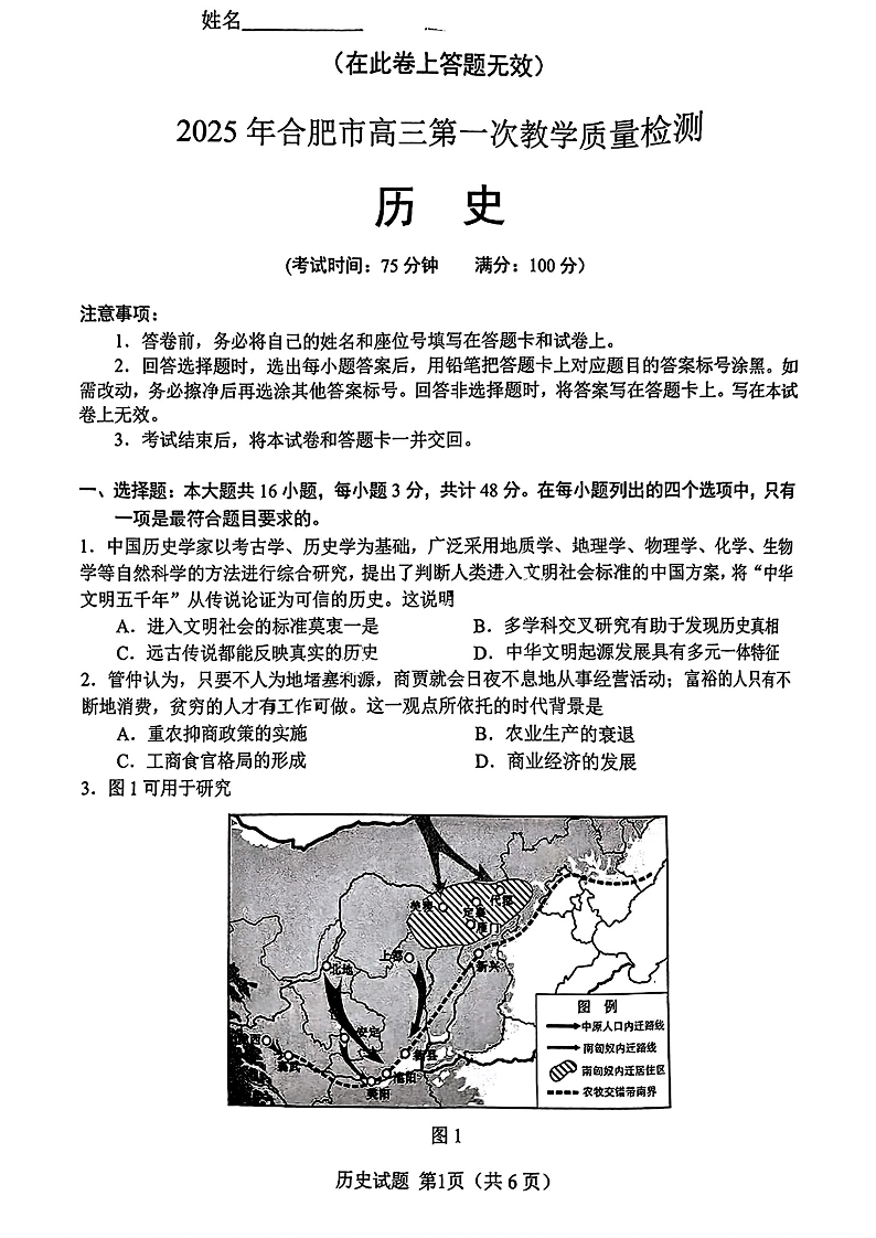 安徽省合肥市2025届高三第一次教学质量检测 历史.pdf