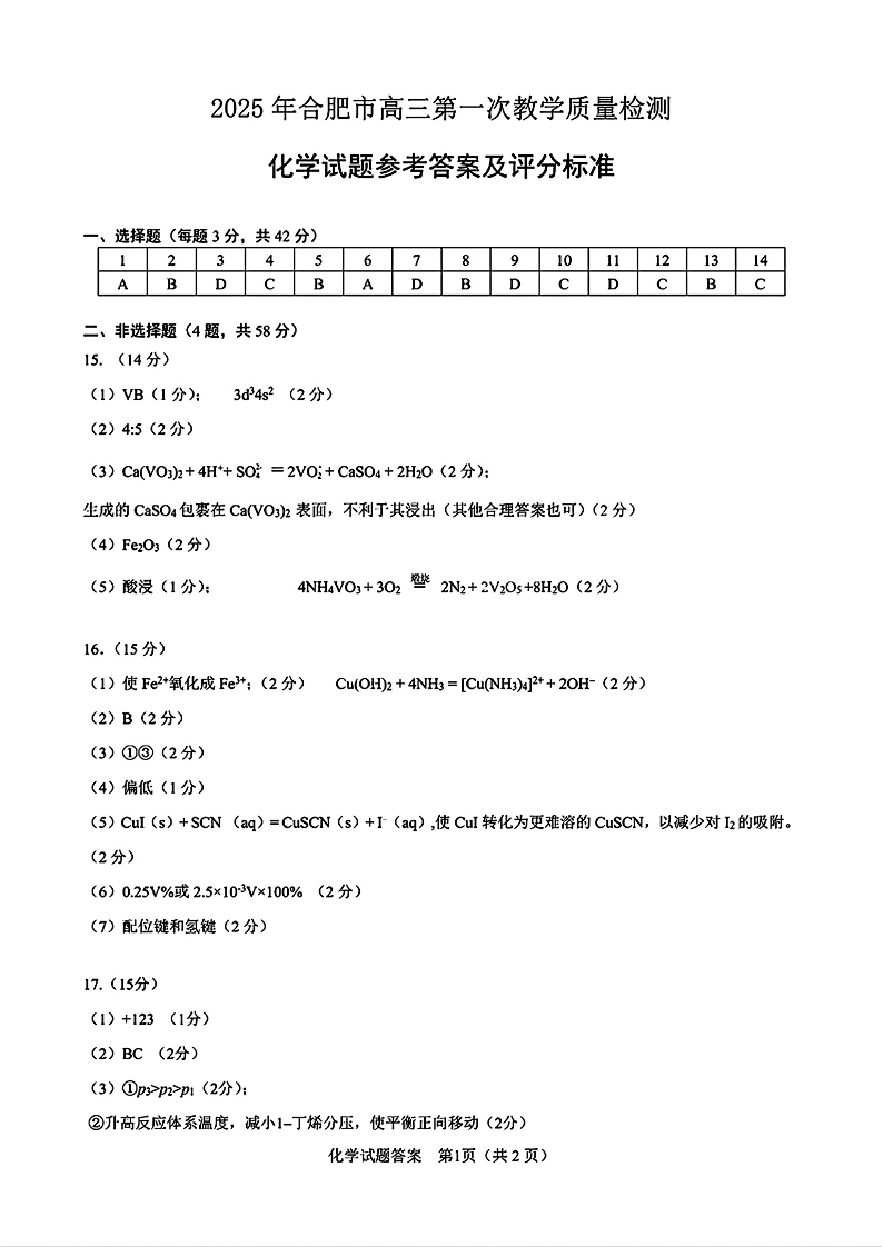 安徽省合肥市2025届高三第一次教学质量检测 化学答案.pdf