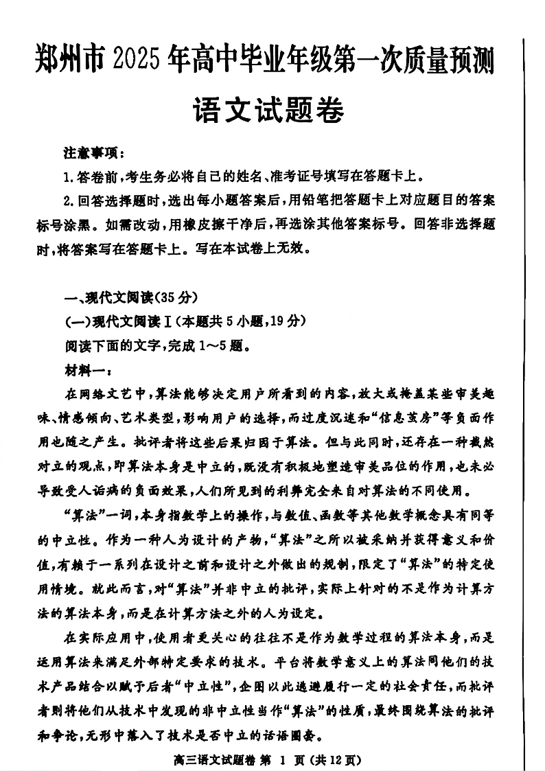 河南省郑州市2025年高中毕业年级第一次质量预测 语文.pdf