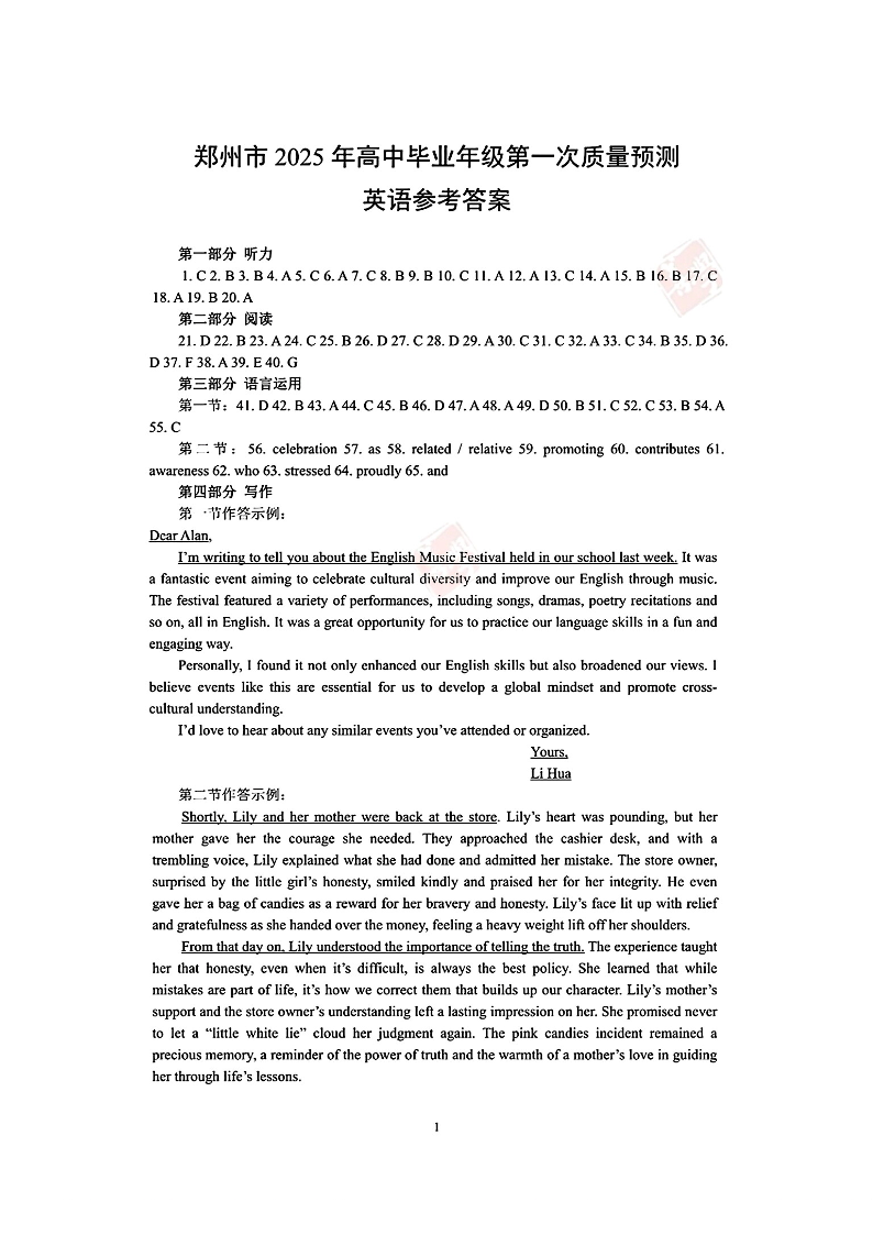 河南省郑州市2025年高中毕业年级第一次质量预测 英语答案.pdf