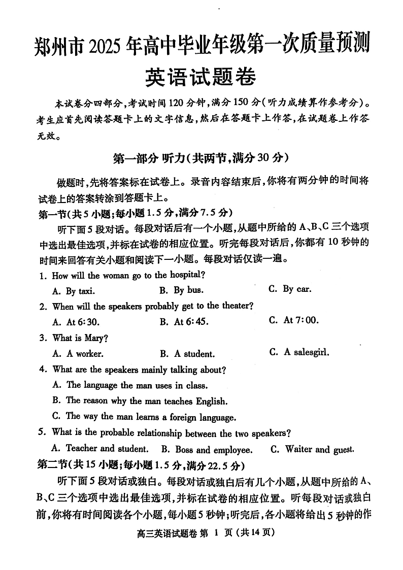 河南省郑州市2025年高中毕业年级第一次质量预测 英语.pdf