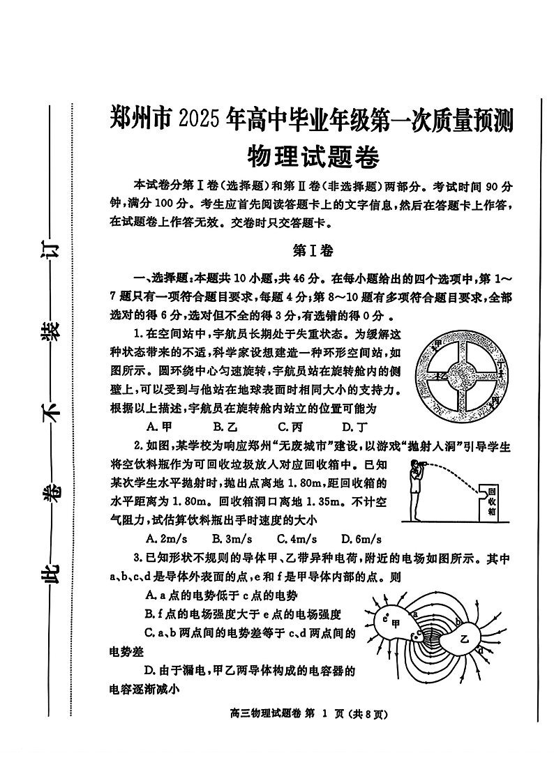 河南省郑州市2025年高中毕业年级第一次质量预测 物理.pdf