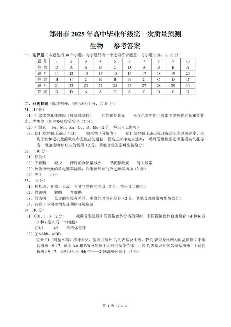 河南省郑州市2025年高中毕业年级第一次质量预测 生物答案.pdf