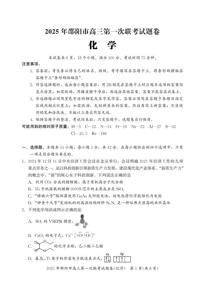2025 年邵阳市高三第一次联考化学试题.pdf