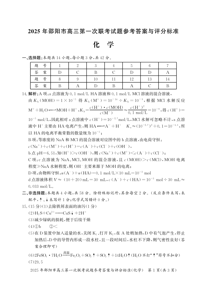 2025 年邵阳市高三第一次联考化学试题答案.pdf