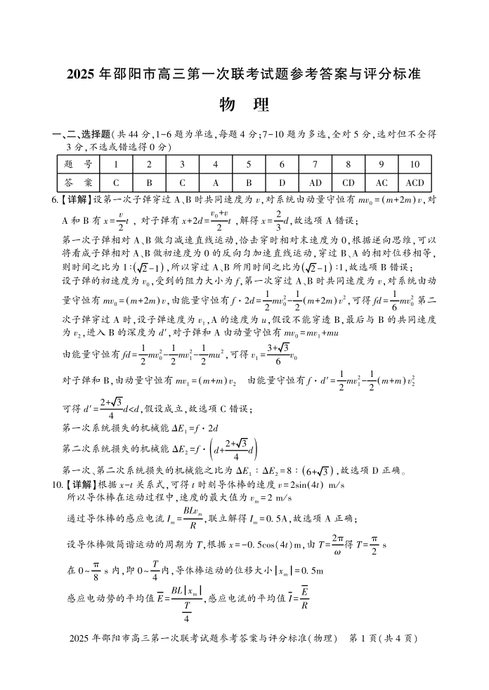 2025 年邵阳市高三第一次联考物理试题答案.pdf