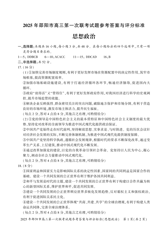 2025 年邵阳市高三第一次联考政治试题答案.pdf