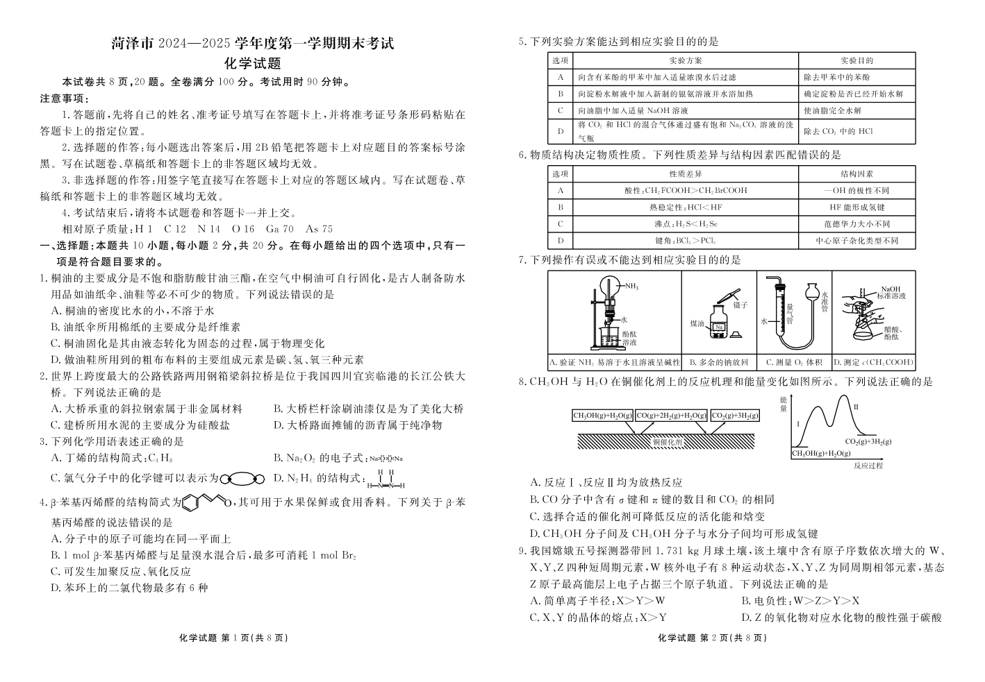 山东省菏泽市2024-2025学年高三上学期1月期末化学+答案.pdf