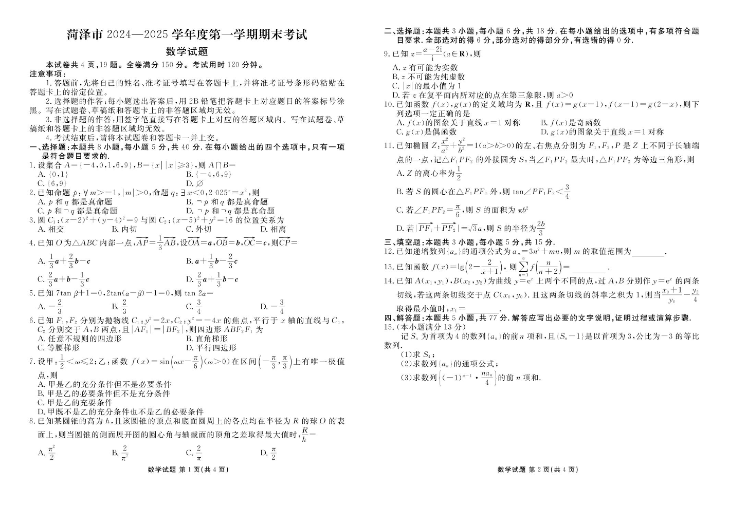 山东省菏泽市2024-2025学年高三上学期期末考试数学试题.pdf