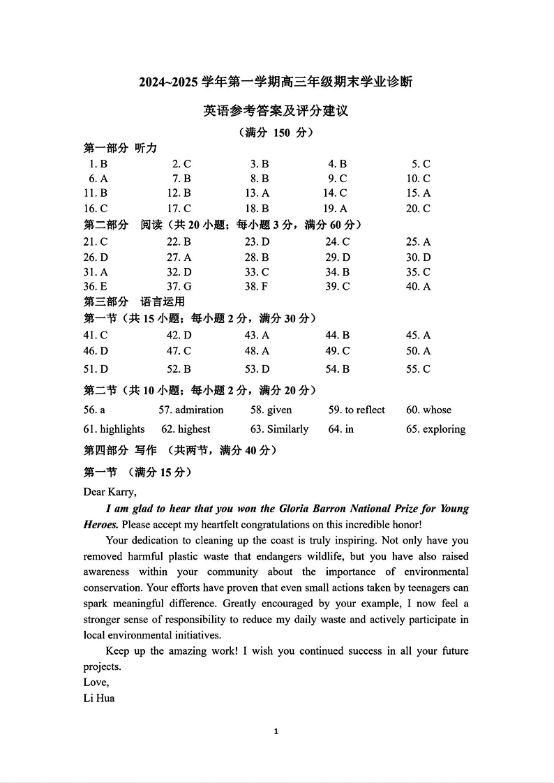 山西太原2024-2025学年高三期末学业诊断英语答案.pdf