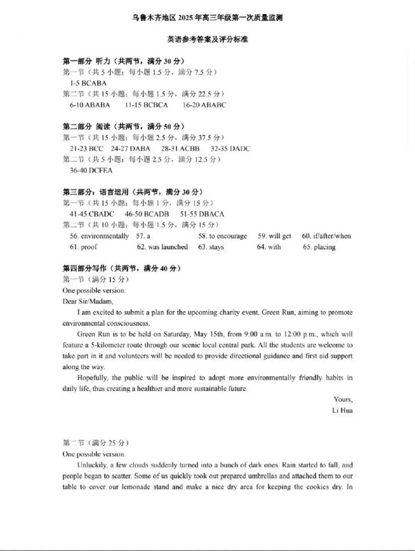 新疆乌鲁木齐地区2025届高三上学期第一次质量监测 英语答案.pdf