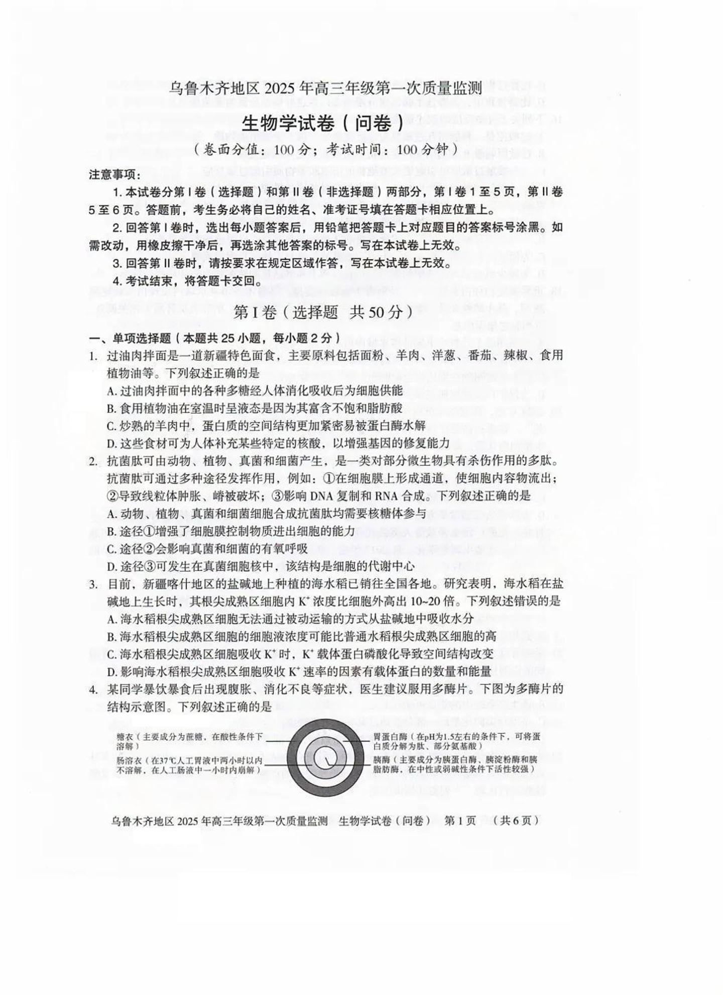 新疆乌鲁木齐地区2025届高三上学期第一次质量监测 生物.pdf