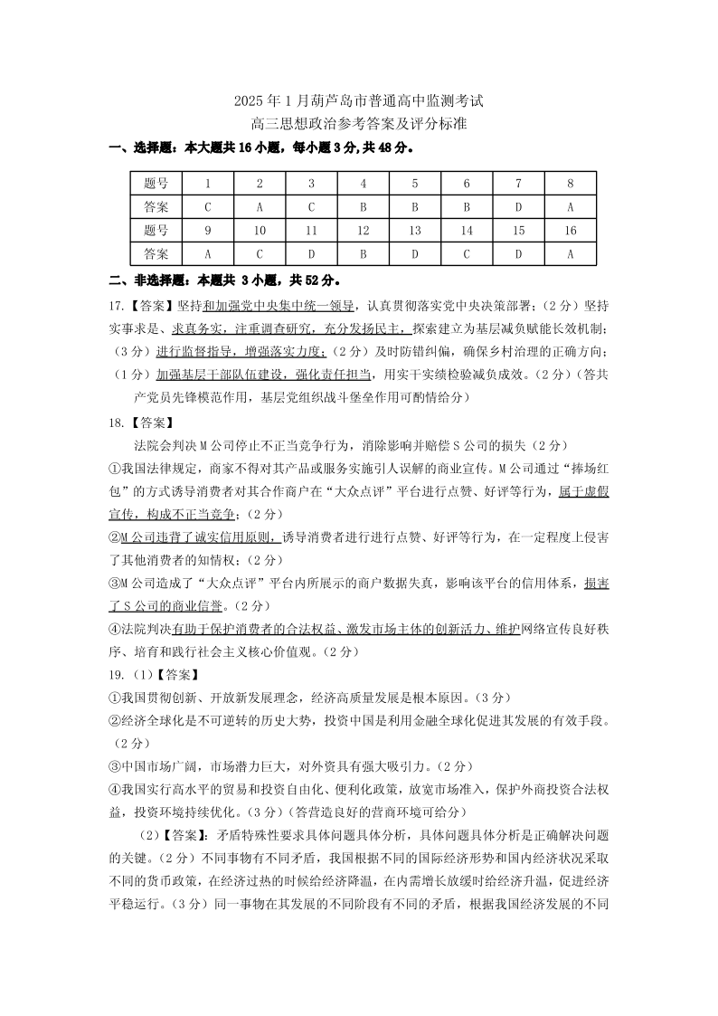 辽宁省葫芦岛市2025届高三上学期1月期末考试 政治参考答案.pdf