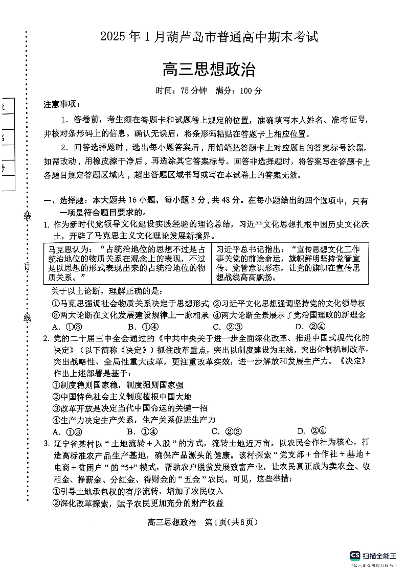 辽宁省葫芦岛市2025届高三上学期1月期末考试 政治.pdf